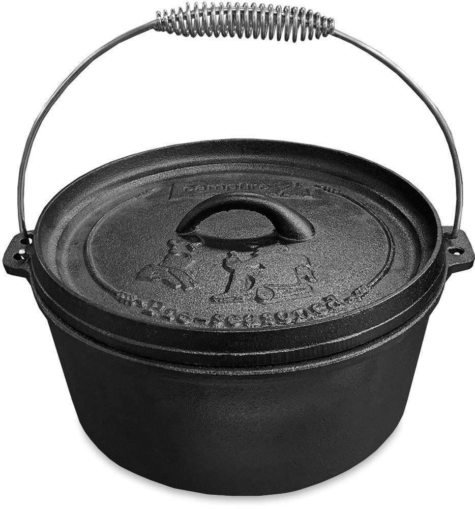 Made with solid pre-seasoned cast iron and featuring a flanged lid to keep coals on top, and a spiral carry handle that makes carrying a full camp oven comfortable.