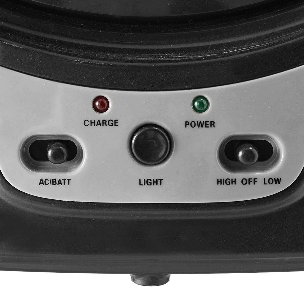 This fan is the perfect size for larger tents or a caravan and comes with a lithium ion battery that’s rechargeable and will turn green when fully charged. It comes with LED lights that can be operated independently and has two fan settings for use. You can also run it on 12V or 240V depending on your set up, as it comes with the adaptors included.
