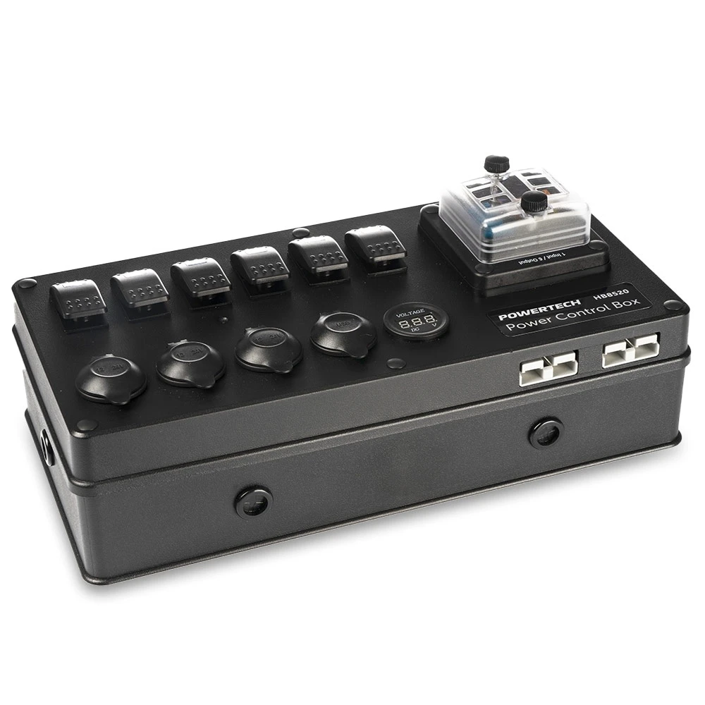 Manage all your 12V appliances in one place, with the handy DC Control Box for External Battery with Voltage Display from Powertech.