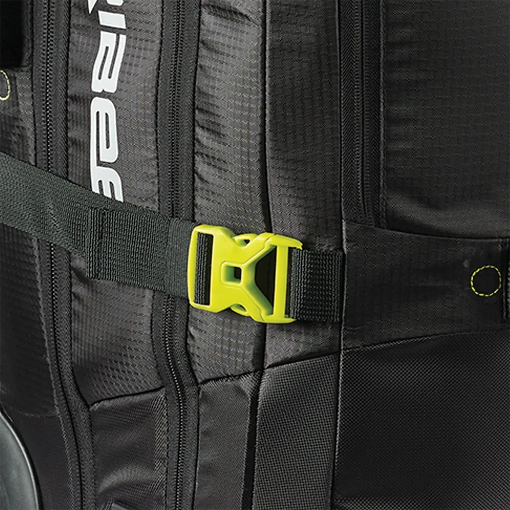 Base slide rails and grippy grab handles make for easy manoeuvring of your getaway gear, while heavy-duty zippers offer ultimate pack protection. This bag literally gets off your back about the tougher stuff too, thanks to oversized wheels that take you anywhere from the pebbles to pavement.
