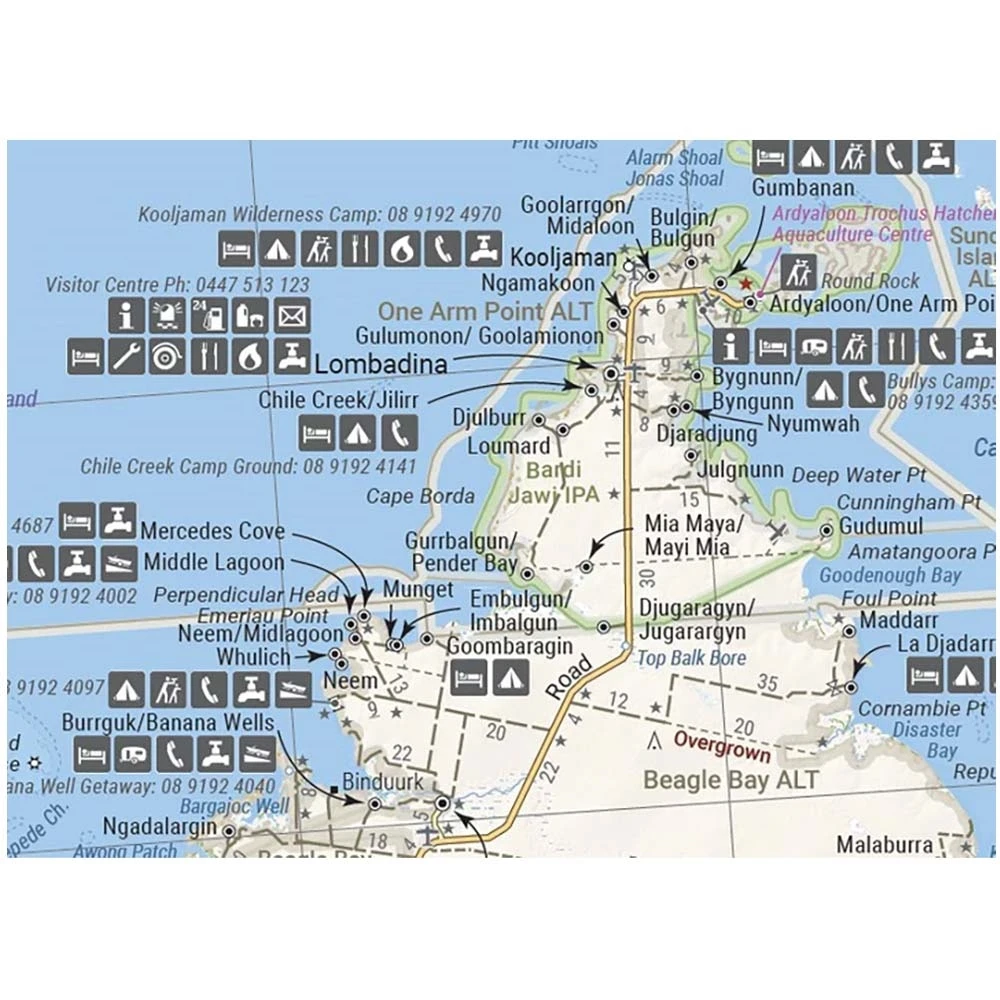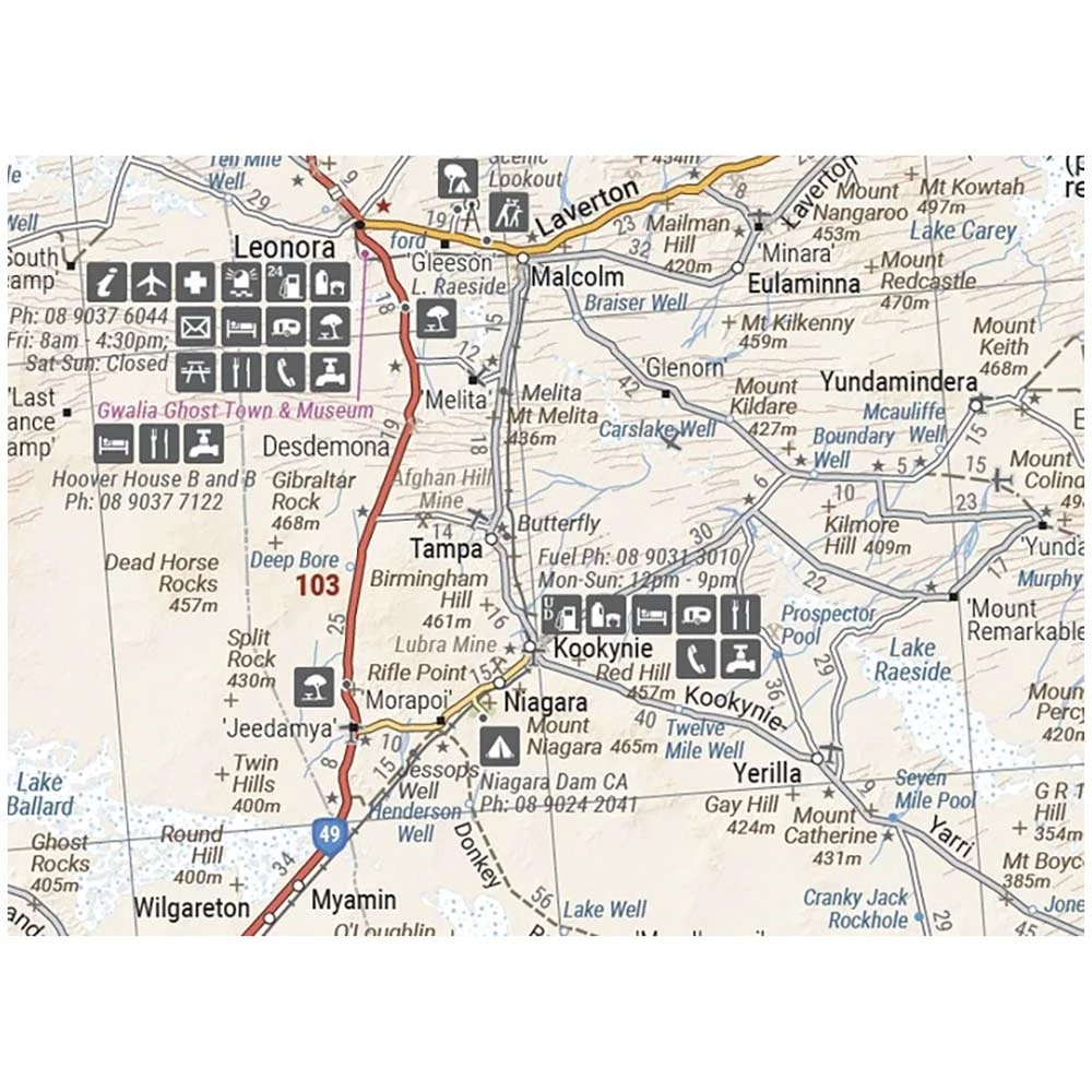 - Roads and 4WD tracks, distance markers, topographical relief and touring points of interest, 24-hour fuel, camping areas and caravan parks, facilities, services, and more