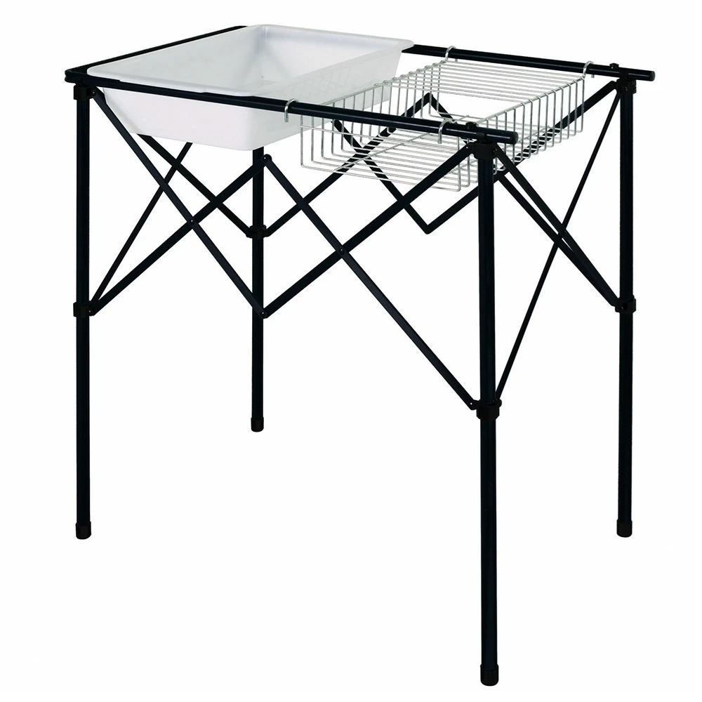 - Standalone dishwasher station includes an integrated plastic sink and wire dish drainer