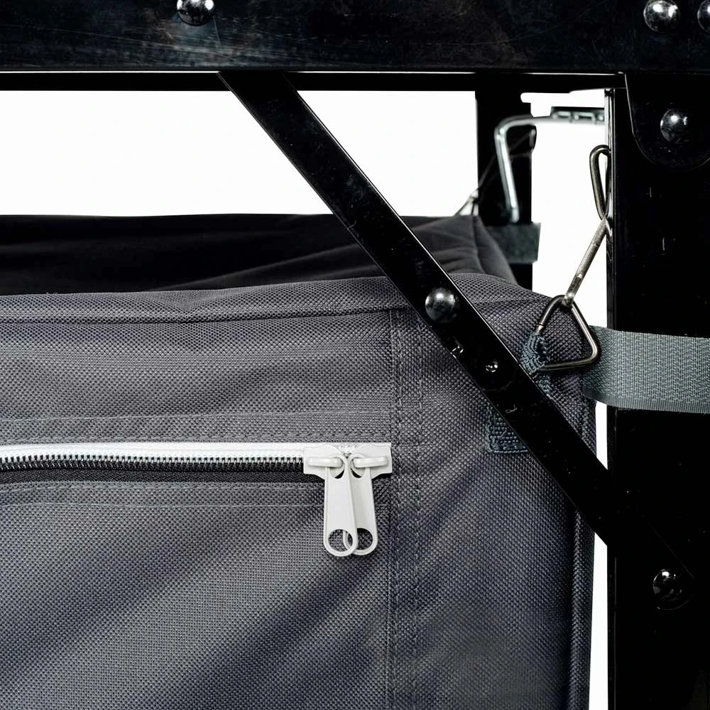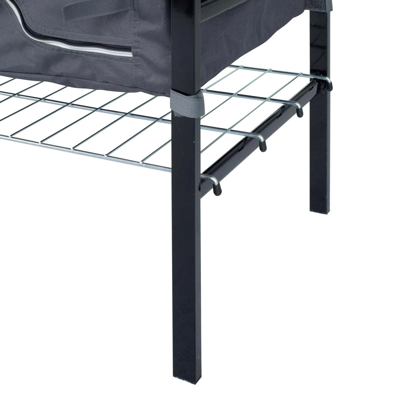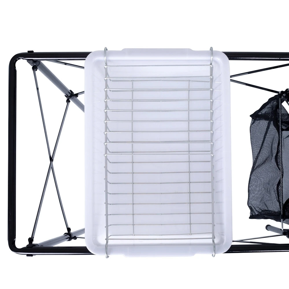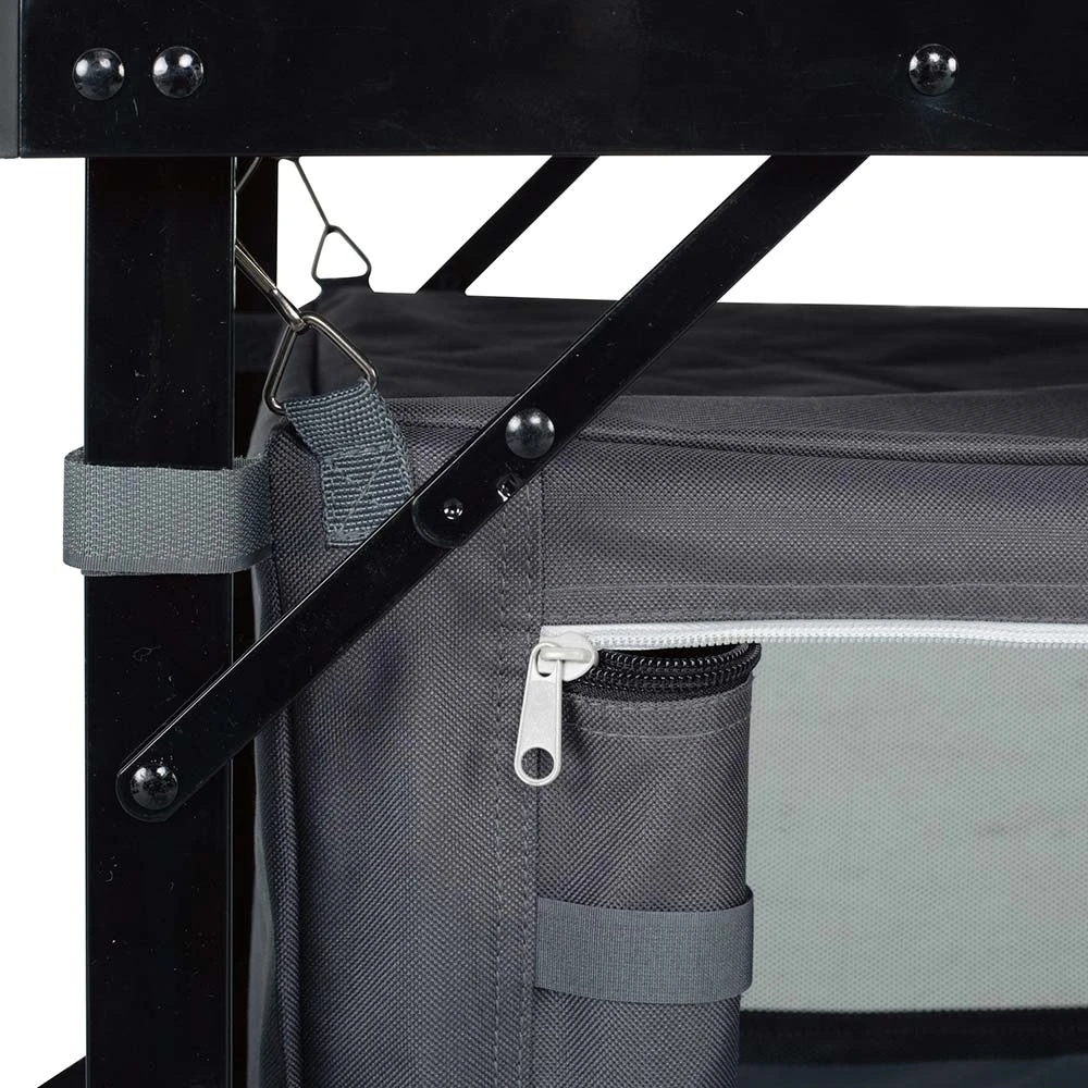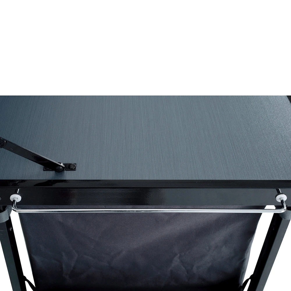 This kitchen is a camp chefs dream! It’s a complete apparatus with a powder-coated steel structure, but with all the features to make an efficient kitchen setup. With a standalone dishwashing station, enjoy easy washing in the integrated sink, wire dish drainer and side wing drying rack. The mesh rubbish bin eats what you don’t want to, and the pull-out tea towel holder is helpful for handwashing.