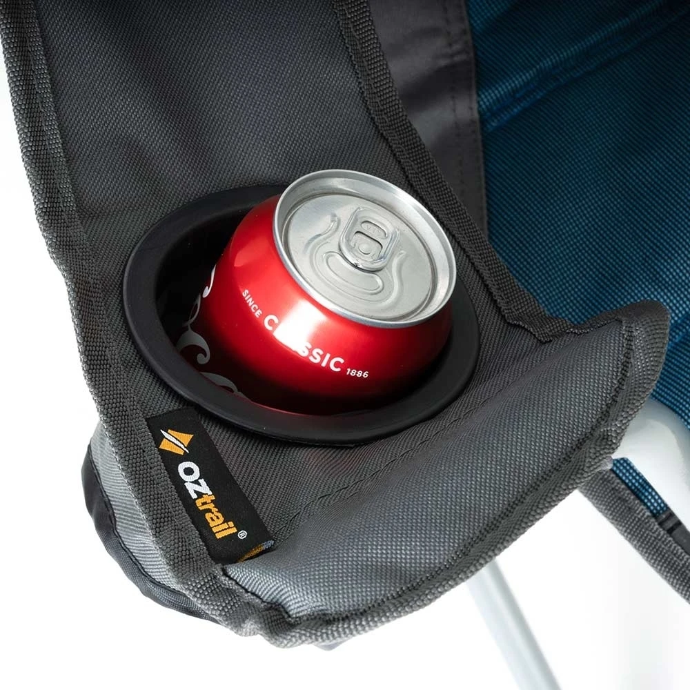 Wide arms allow for a roomy respite and cuddles by the campfire, where baffled padding offers comfort as you sink into serenity. Kick back after tackling the tracks thanks to its strong high-tensile steel frame and go from sitting to slogging quickly thanks to the grab-and-go strap on the back. For hydration in those mountain-top moments, enjoy the large drink holder and side organiser for keep-safe knick-knacks.