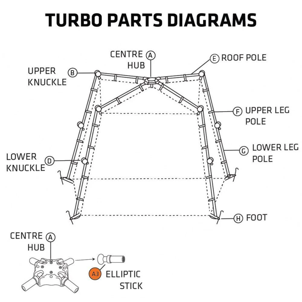 Let me introduce you to the Turbo X-Lite LF Elliptic Stick- Part A3. This little guy is made of durable plastic and clicks into your Turbo X-Lite Centre Hub (Part A) at one end and your Roof Poles (Part E) at the other end.