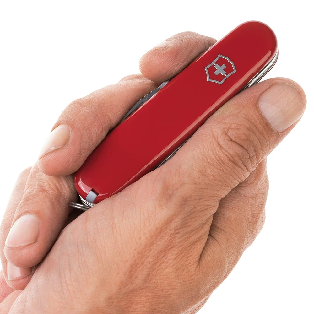 - Features: Large blade, small blade, can opener, 3mm and 5mm screwdriver, bottle opener, wire stripper, reamer, punch, sewing awl, corkscrew, wood saw, toothpick, tweezers, and key ring